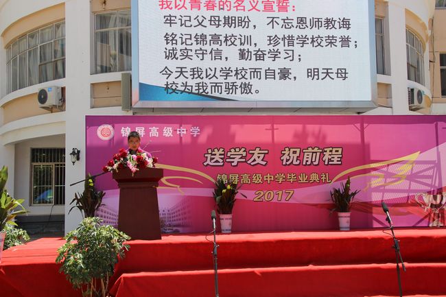 5月26日上午,锦屏高级中学举行2017届“送学友,祝前程”毕业典礼。全校师生和部分高三学生家长参加盛典。典礼由“深深祝福”“继往开来”“展翅高翔”“把根留住”“情深意长”五个篇章组成,设置了文艺献演、代表致词、班主任寄语、优秀毕业生证书颁发、班旗交接、毕业集体宣誓、向母校赠送航舵、毕业留影等环节。